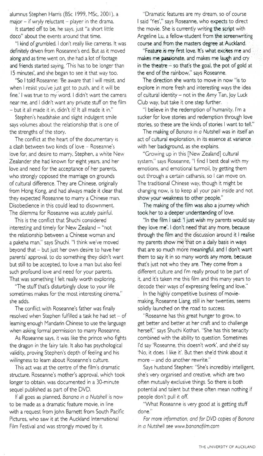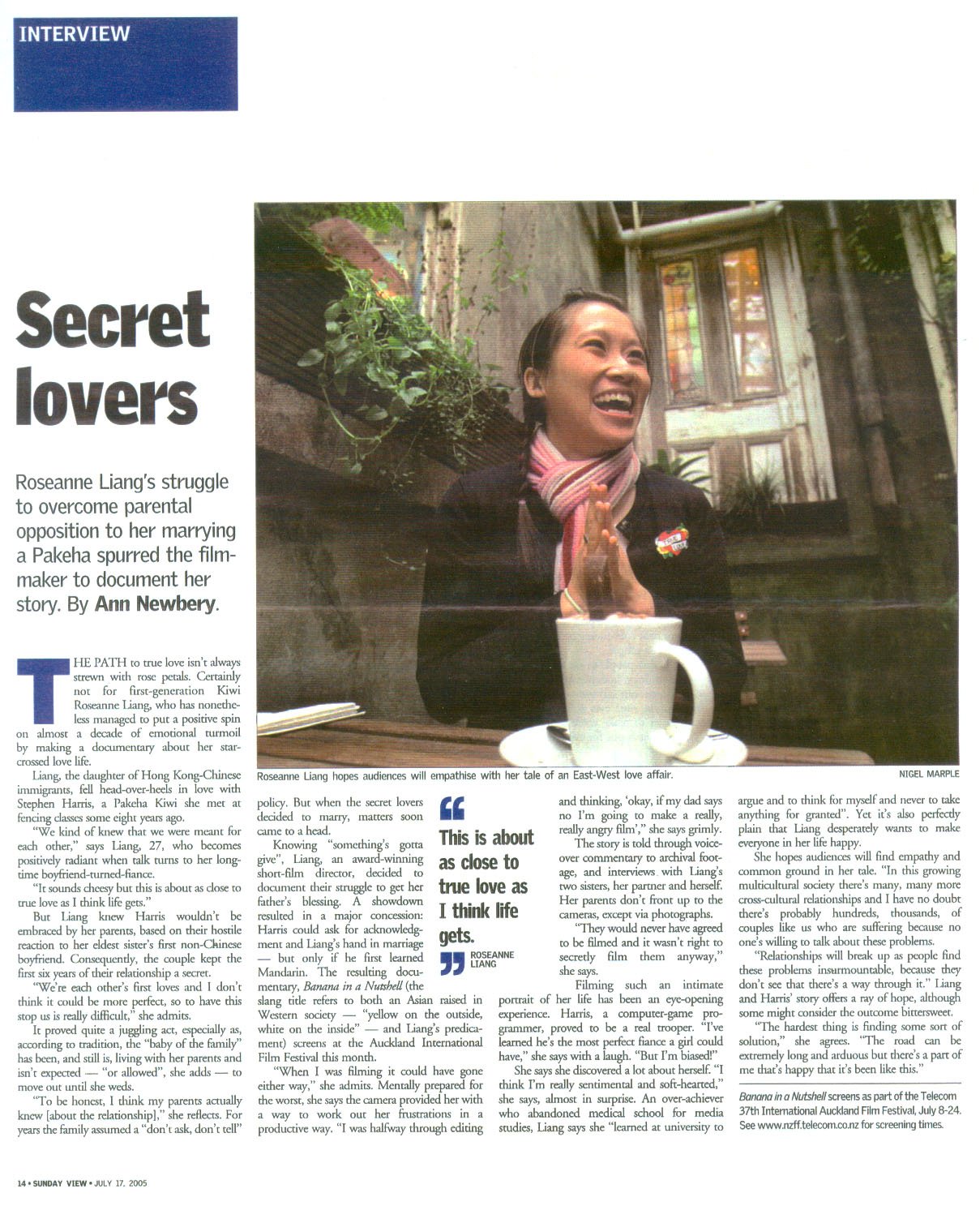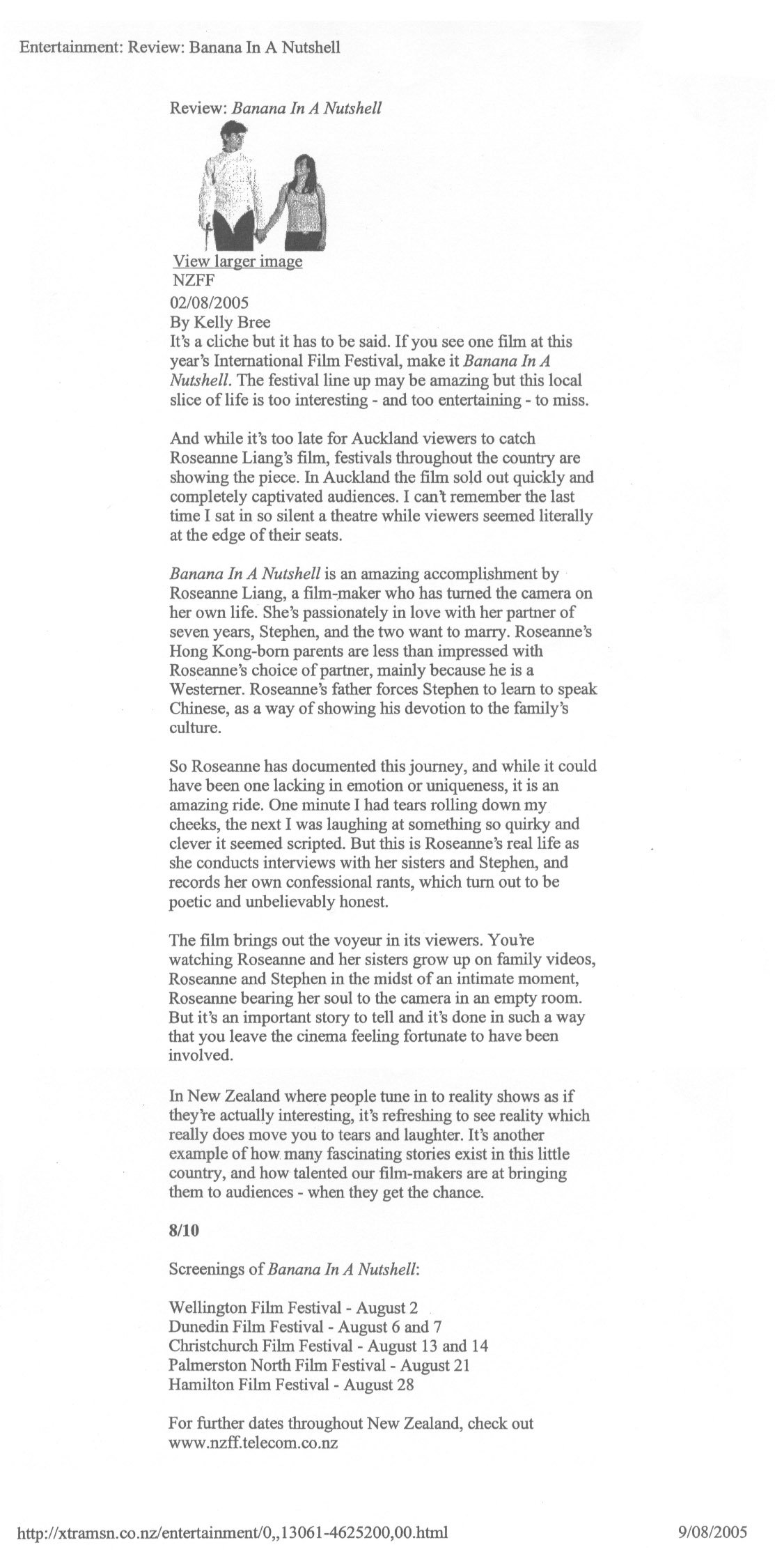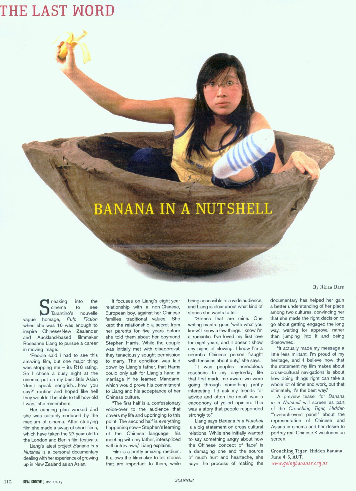 "The film is very heartfelt, especially one scene in which Roseanne tearfully tries to understand why her parents never show her any outward signs of affection. Does this mean they don't love her, she wonders? Yet why would they have worked so hard to provide for her, if not out of love? This is something I think many young bbcs will have thought about at some point in their lives. If you get a chance to see it, I highly recommend 'Banana in a Nutshell'."